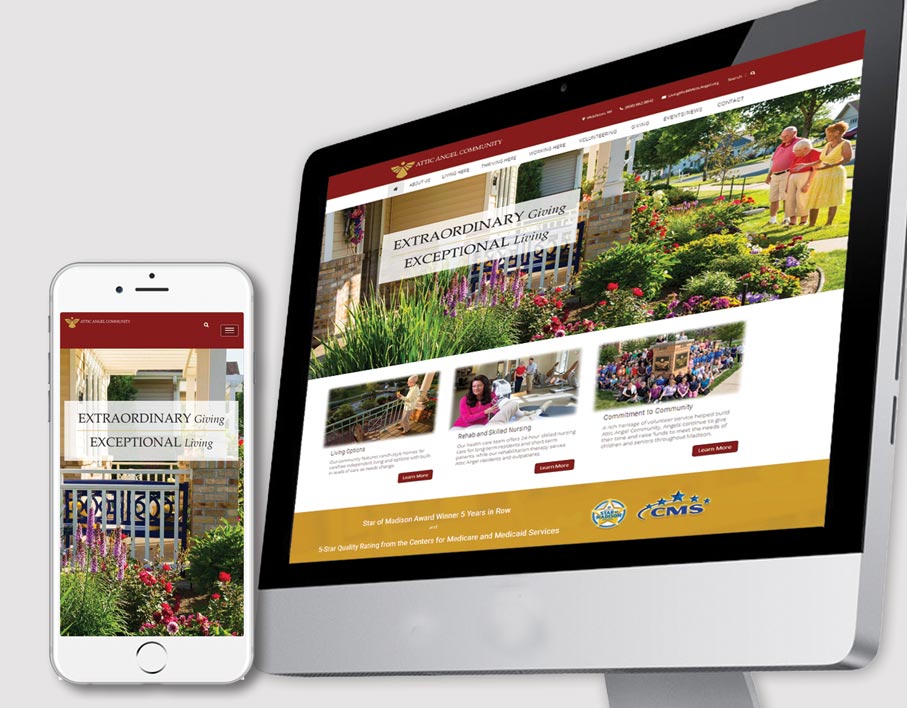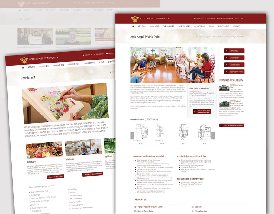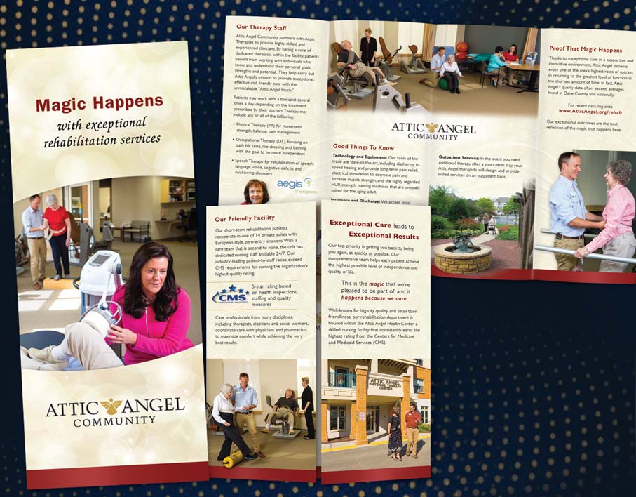 Redesigned website, designed company and rehabilitation services brochure with provided content. Designed wrap for transportation van, letterhead, company folders, and annual report. Attic Angel Community is an assisted living community in Madison, WI.