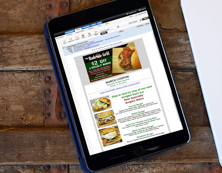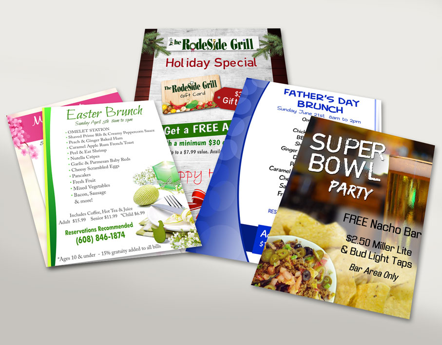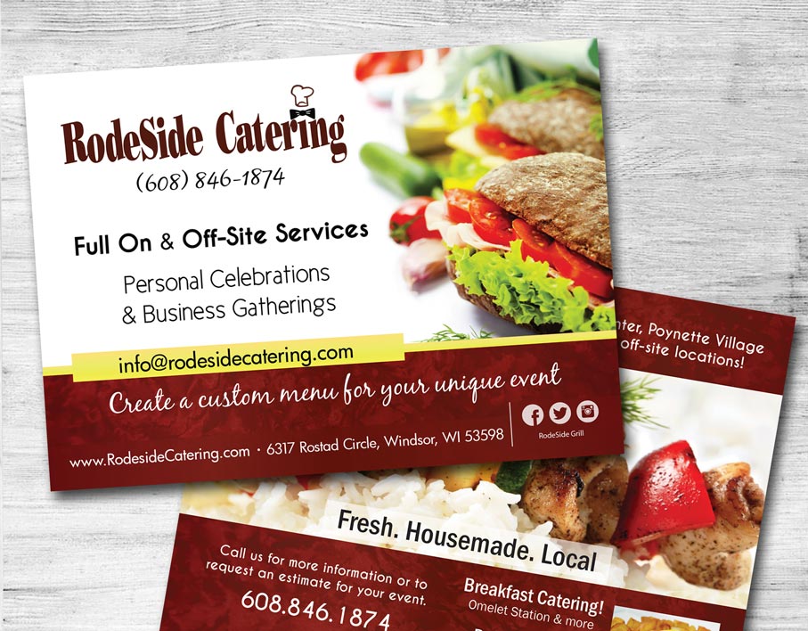 Redsigned logo, designed event stands, product photography, catering postcard, and email blasts for independently owned restaurant in Windsor, WI.